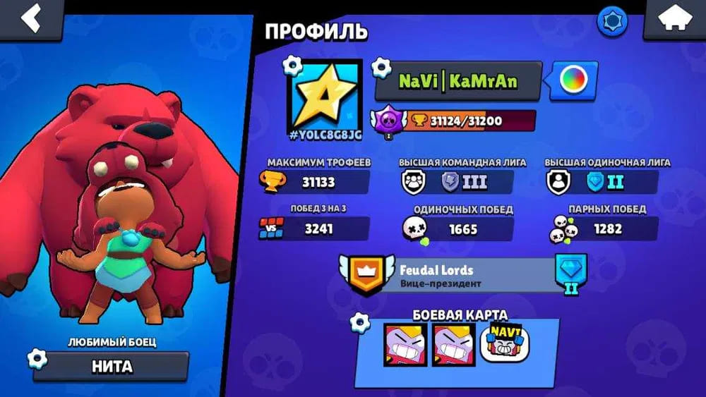 🏆Кубков: 31124; ⭐Уровень: 243; 💪Бойцов: 56/72; ⚡Леги: Леон, Мэг, Спайк, Честер, Ворон, Сэнди, Амбер;