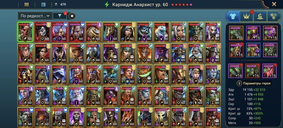 ⚡Уровень: 100 🔥Количество героев:: 479 💪Сила: 8,3 млн